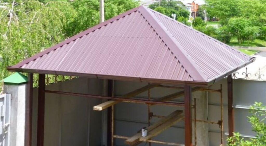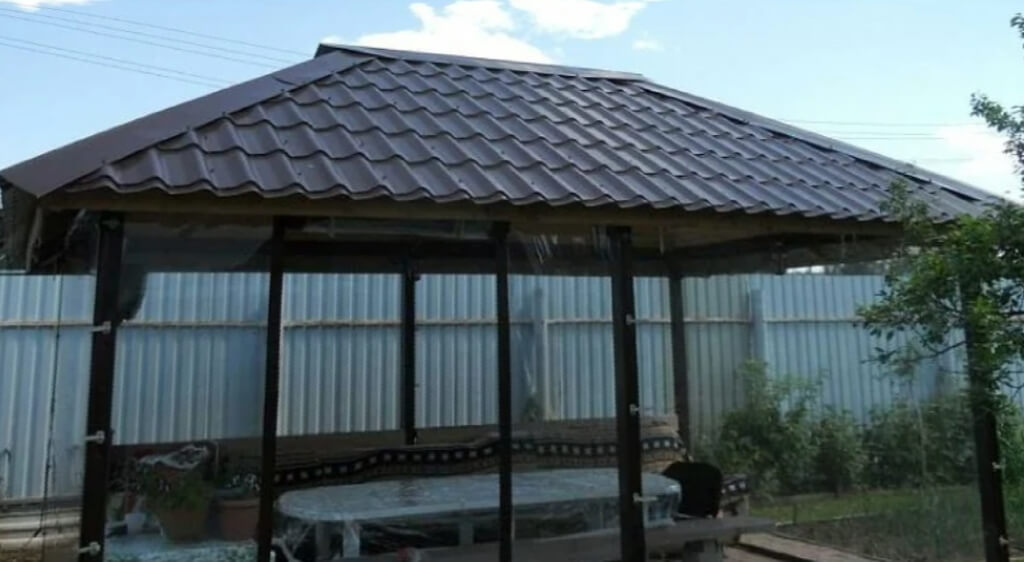 Но тут тоже есть особенности. Внешний вид – более утилитарный. Поэтому он не всегда гармонирует с декоративными беседками. Да и в жаркий день такая крыша сильно нагревается, создавая эффект «парника».