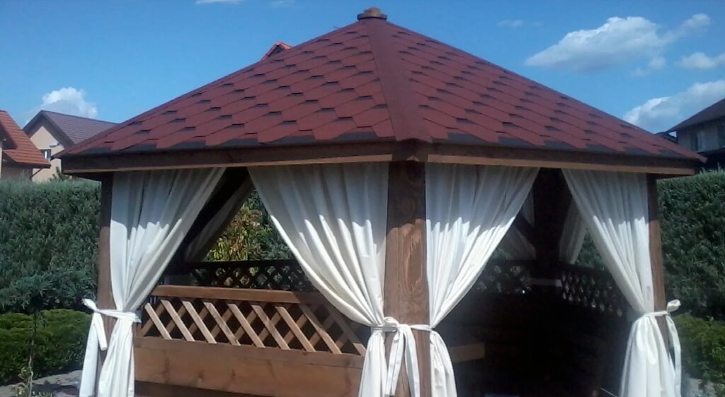 Беседка под такой крышей в сильный ливень будет тихой. Еще одно достоинство – огромный выбор расцветок и форм нарезки. Из минусов выделим необходимость сплошного основания из влагостойкой фанеры или ОСП. А это повышает затраты на сравнительно высокую цену самого покрытия.