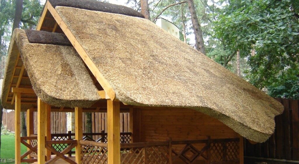 Нельзя не вспомнить и про натуральные покрытия. Солома, тростник или камыш создают атмосферу этно-стиля и «живой» природной крыши. Если материал обработать антипиренами, он будет относительно безопасен. Деревянный гонт придает постройке особый колорит и экологичность. Хотя для его монтажа нужно проявить особое мастерство. А для временных летних конструкций подойдут тканевые покрытия – плотные акриловые полотна с влагостойкой пропиткой.
